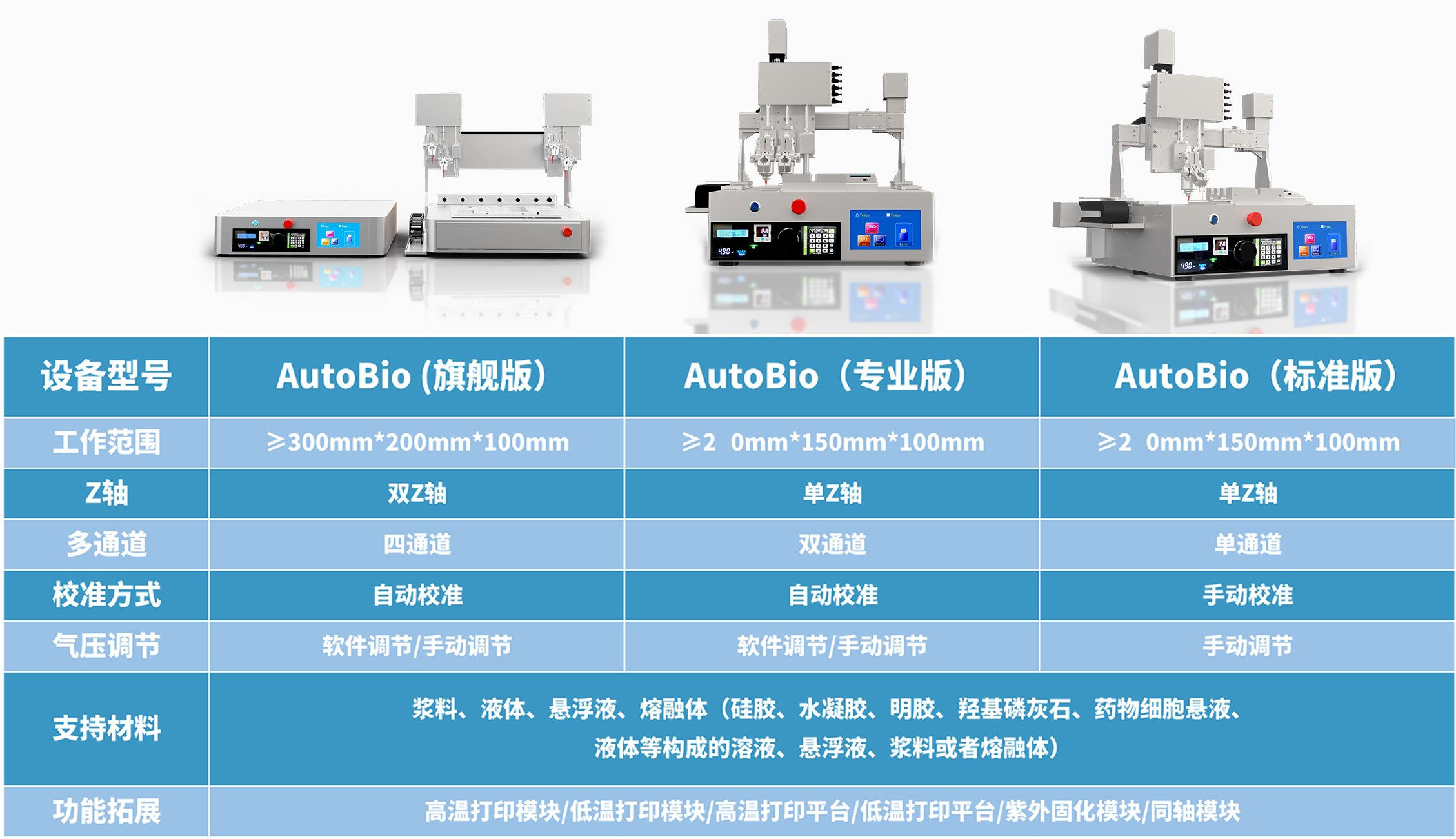 AutoBio系列DIW墨水直寫3D打印機,是森工科技自主研發(fā)的科研型3D打印設備,包含標準版、專業(yè)版以及旗艦版等不同配置版本,支持多模態(tài)、多功能的拓展和定制需求。采用獨立雙Z軸的設計、拓展塢設計、非接觸式自動校準設計,適配多種打印平臺,擁有多種打印幅面。能夠滿足科研的多參數(shù)、數(shù)字化、高精度、小體積、可拓展等需求。 該系列配備多種功能打印模塊通過不同材料,不同模塊的組合,以滿足科研多樣性。設備支持拓展高溫噴頭/平臺、紫外固化模塊、低溫噴頭/平臺模塊、近場直寫/靜電紡絲模塊、旋轉軸打印、在線混合等模塊??芍С謶腋∫?、硅膠、水凝膠、明膠、羥基磷灰石、藥物細胞等材料,廣泛應用生物醫(yī)療、組織工程、食品、藥品、高分子新材料等領域。