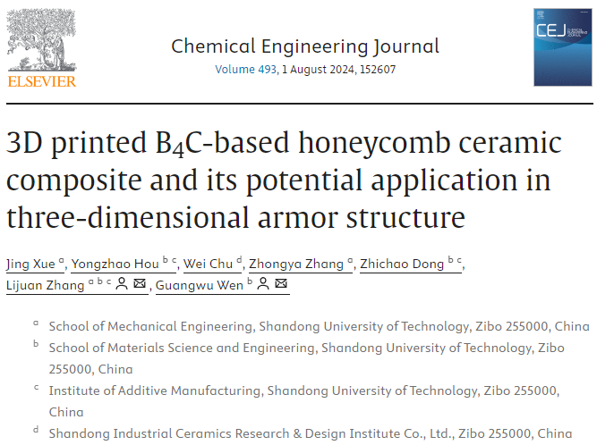 山東理工大學(xué)的研究團(tuán)隊(duì)在《Chemical Engineering Journal》(Volume 493, 1 August 2024, 152607)發(fā)表的題為"3D printed B4C-based honeycomb ceramic composite and its potential application in three-dimensional armor structure"的研究中,通過3D打印技術(shù)(DIW)制造具有蜂窩結(jié)構(gòu)的B4C基復(fù)合材料,以提高材料的抗沖擊性能和韌性。DIW墨水直寫3D打印技術(shù)允許通過控制打印墨水的流動和沉積,精確地構(gòu)建復(fù)雜的幾何結(jié)構(gòu)。研究團(tuán)隊(duì)開發(fā)了一種含有B4C微粉的打印墨水,成功打印出蜂窩結(jié)構(gòu)復(fù)合材料,并經(jīng)過干燥、脫脂和燒結(jié)等工藝處理形成最終材料。