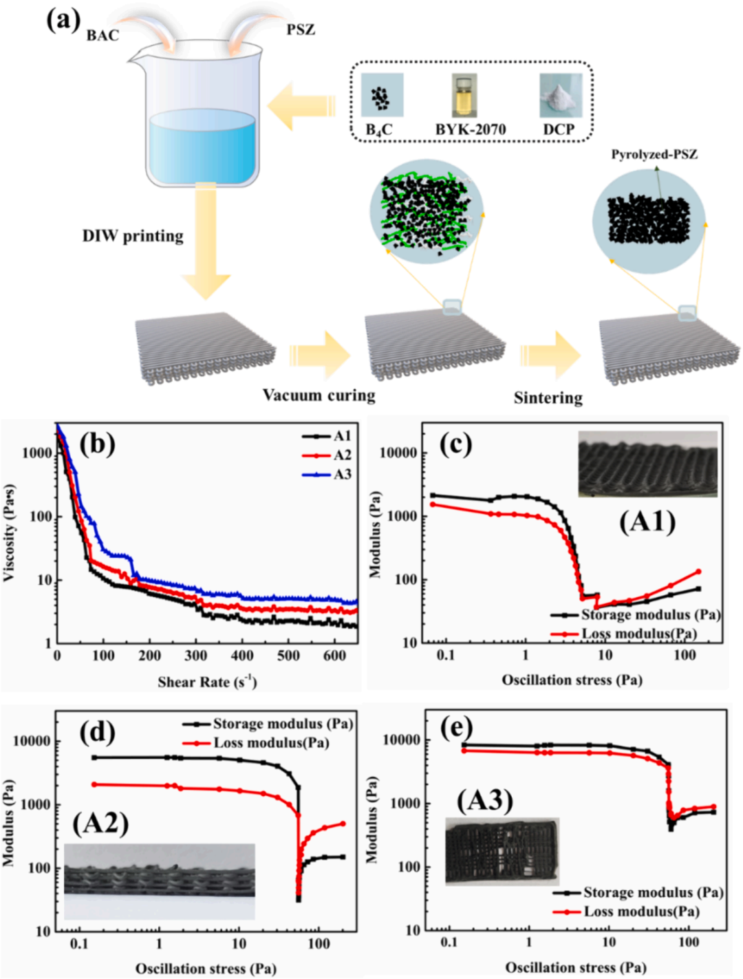 圖1,(a) B4C 油墨制備 B4C 基蜂窩陶瓷工藝示意圖;(b) A1、A2 和 A3 油墨的粘度隨剪切速率的變化;(c)、(d)、(e) 不同 B4C 濃度的 B4C 油墨的模量和印刷單塊:66 wt% (A1)、68 wt% (A2)、70 wt% (A3)。