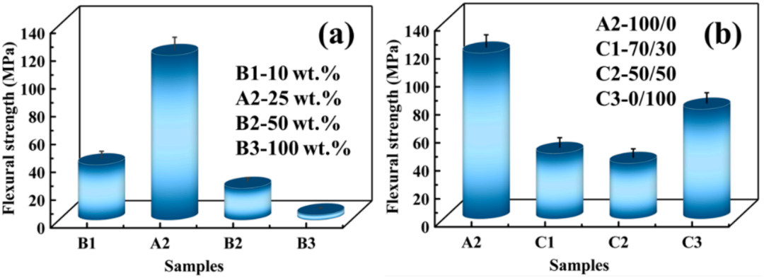 圖2,不同BAC/PSZ比(a)和不同1μm/0.3μm(D50)碳化硼粉末比(b)的油墨的力學(xué)性能。