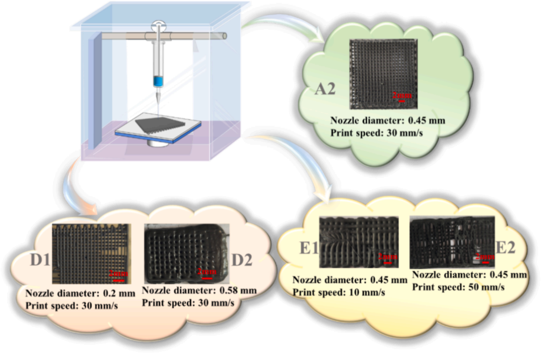 圖3,DIW生產(chǎn)的碳化硼胚體采用不同的擠壓孔(A2、D1和D2)和不同的打印速度(A2、E1和E2)。