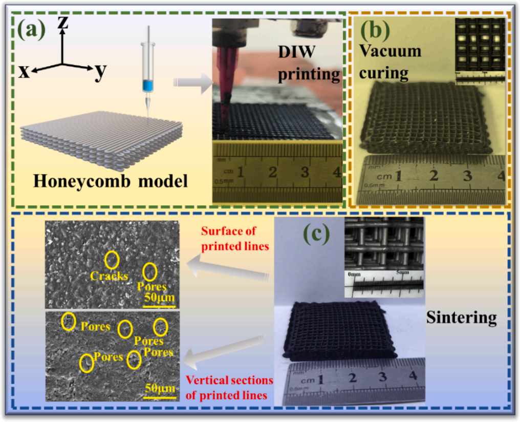圖4,(a) 碳化硼基蜂窩陶瓷復(fù)合材料的制備工藝;(b) 打印后的蜂窩結(jié)構(gòu);(c) 燒結(jié)后的蜂窩陶瓷;(d) 蜂窩結(jié)構(gòu)的SEM圖像。