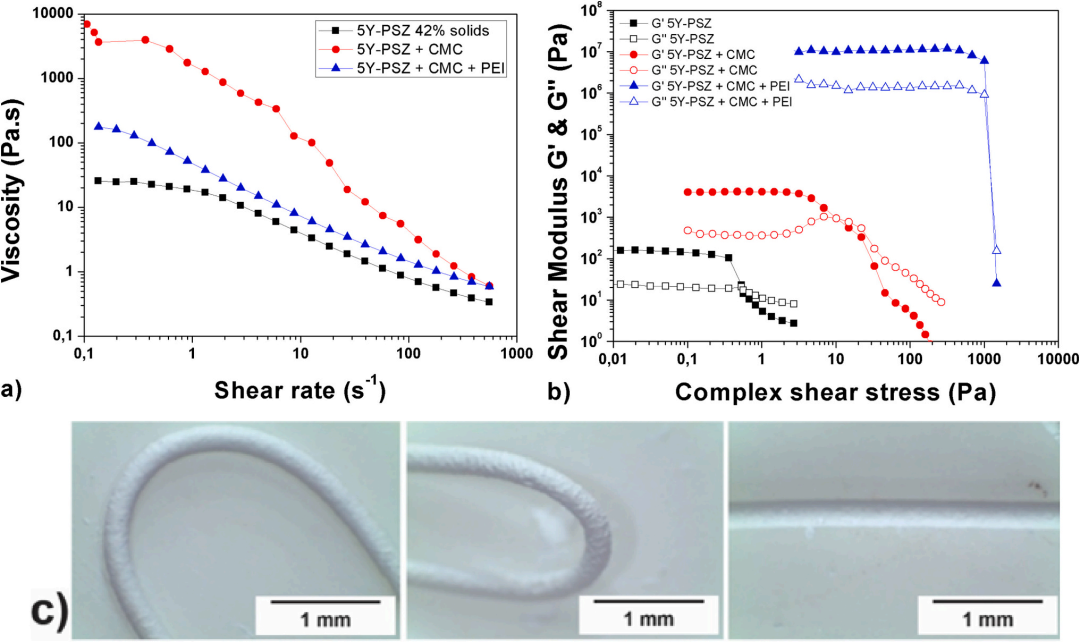 開發(fā)高固含量(42體積%)的5Y-PSZ陶瓷墨水,采用膠體法配制,添加羧甲基纖維素(CMC)和聚乙烯亞胺(PEI)。