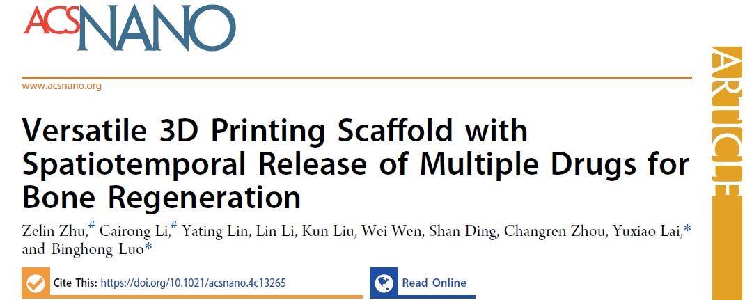 近日,暨南大學(xué)羅丙紅教授團(tuán)隊聯(lián)合中國科學(xué)院深圳先進(jìn)技術(shù)研究院的賴毓霄研究員團(tuán)隊共同開發(fā)了一種具有多種藥物和活性分子分時控釋的多功能3D打印促骨再生支架。