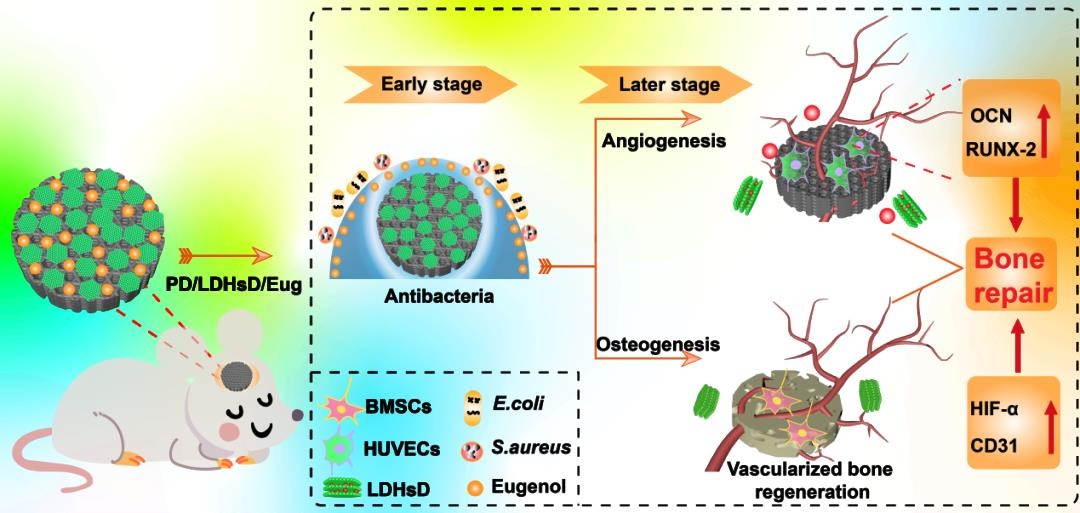 (圖示包含早期抗菌、后期成骨和血管生成過程,涉及E.coli、S.aureus、BMSCs、HUVECs等細(xì)胞及OCN、RUNX-2、HIF-α、CD31等標(biāo)志物)