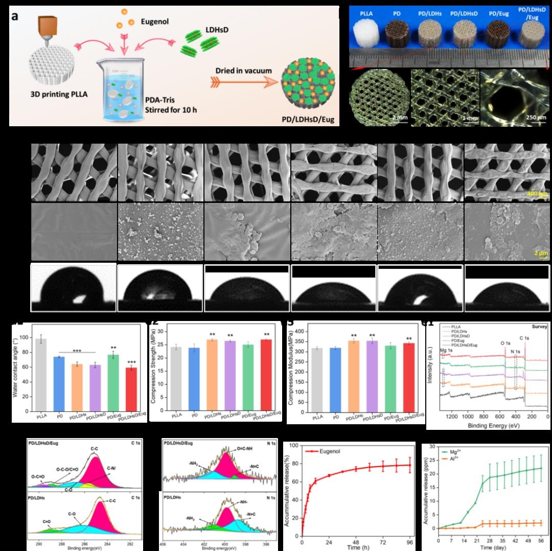 在這一研究中,該團(tuán)隊利用PDA將負(fù)載DMOG的LDHs(LDHsD)和丁香酚(Eug)同步修飾到3D打印的PLLA支架表面。由于PDA與LDH含有豐富的氨基和羥基,因此修飾后的復(fù)合支架親水性增強(qiáng)。