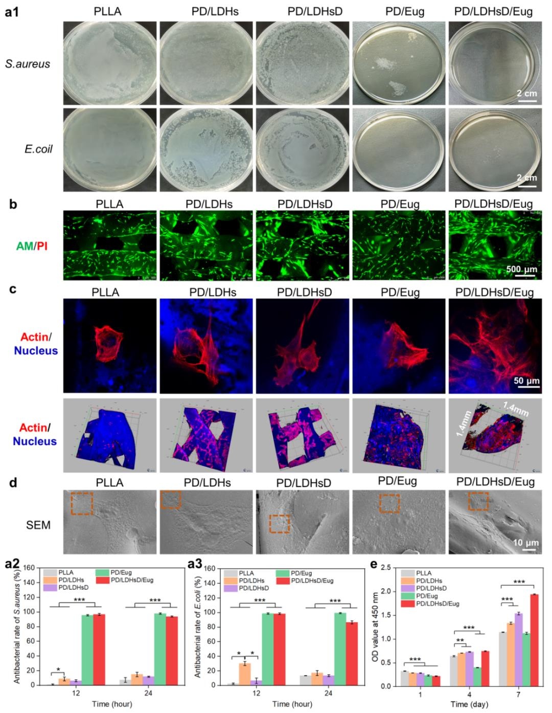 該團(tuán)隊通過聚多巴胺(PDA)成功地將天然抗菌劑—丁香酚和載有成血管的二甲基草酰甘氨酸(DMOG)的層狀雙氫氧化物(LDHs)加載到3D打印的PLLA支架表面。由于丁香酚的早期釋放,支架最初表現(xiàn)出很強(qiáng)的抗菌作用,而LDH持續(xù)釋放的DMOG在后期提供了促進(jìn)長期的成骨和血管生成的能力。