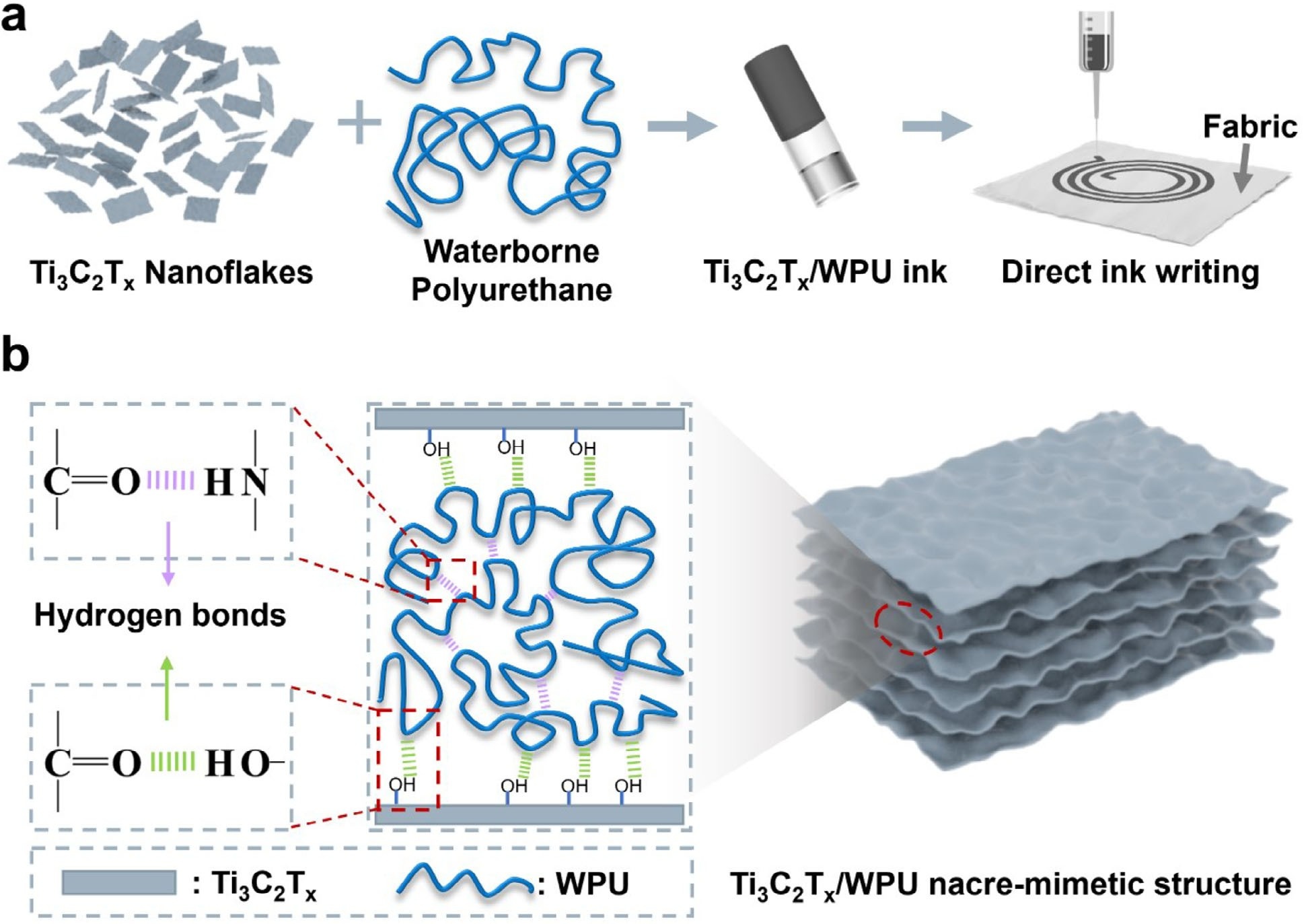 1. 墨水配方:將Ti?C?T?薄片分散于去離子水中(濃度200 mg/mL,20 wt.%),與不同濃度WPU混合(2000 rpm攪拌5分鐘),最終選擇10 wt.% WPU為最優(yōu)配方。