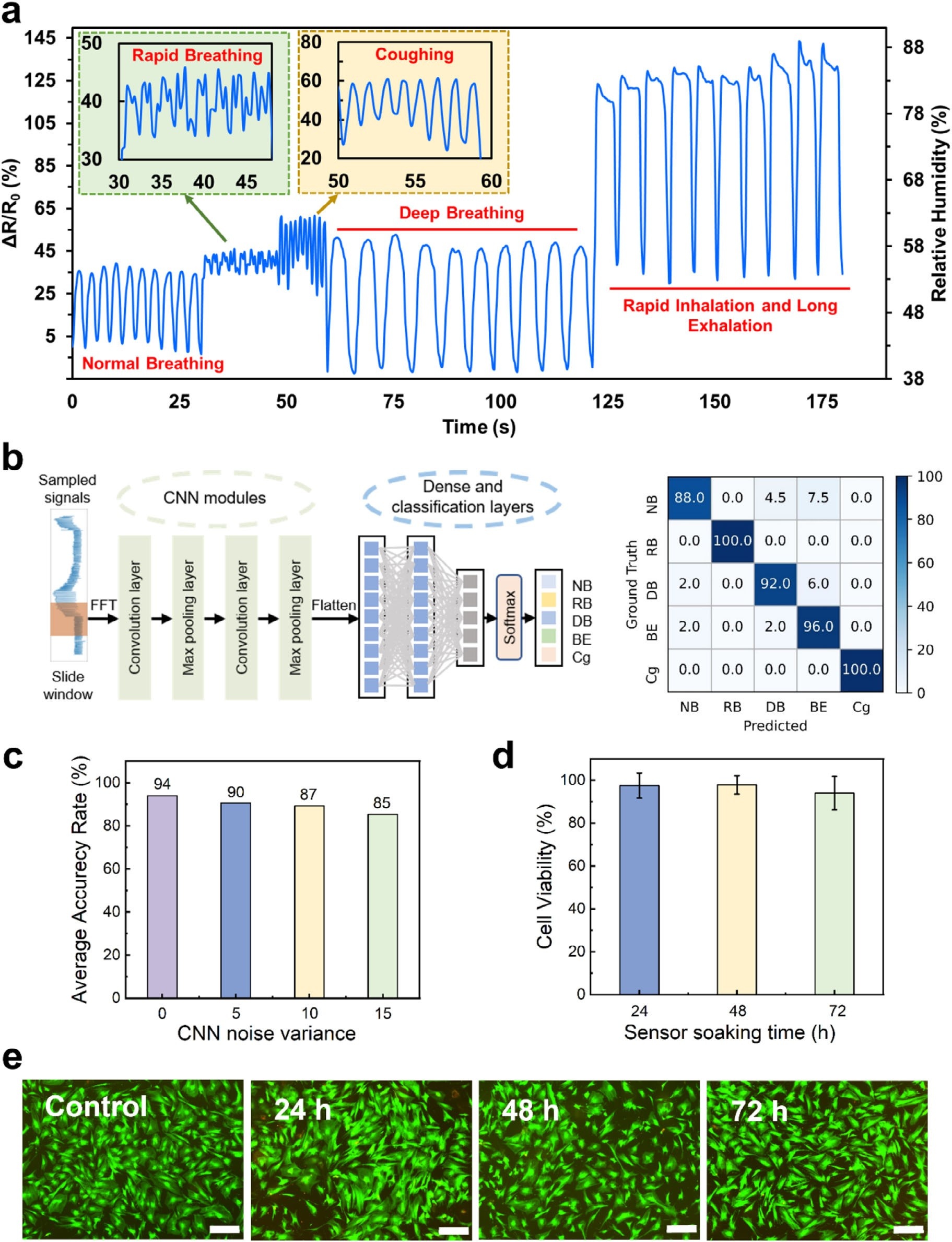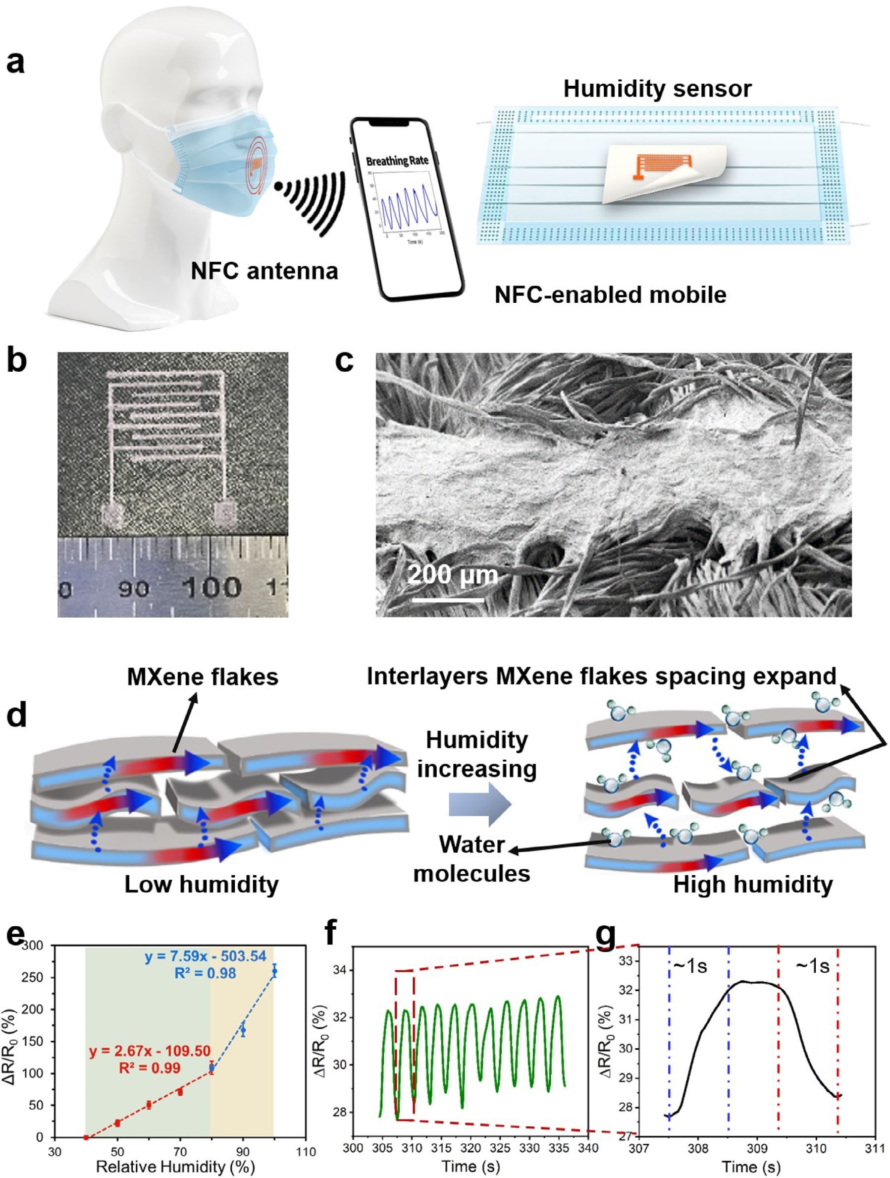 2. 傳感機(jī)制(圖5d):濕度升高時(shí),MXene層間吸附水分子,層間距擴(kuò)大→電子傳輸減少→電阻增加;濕度降低時(shí)層間距收縮→電阻恢復(fù)。