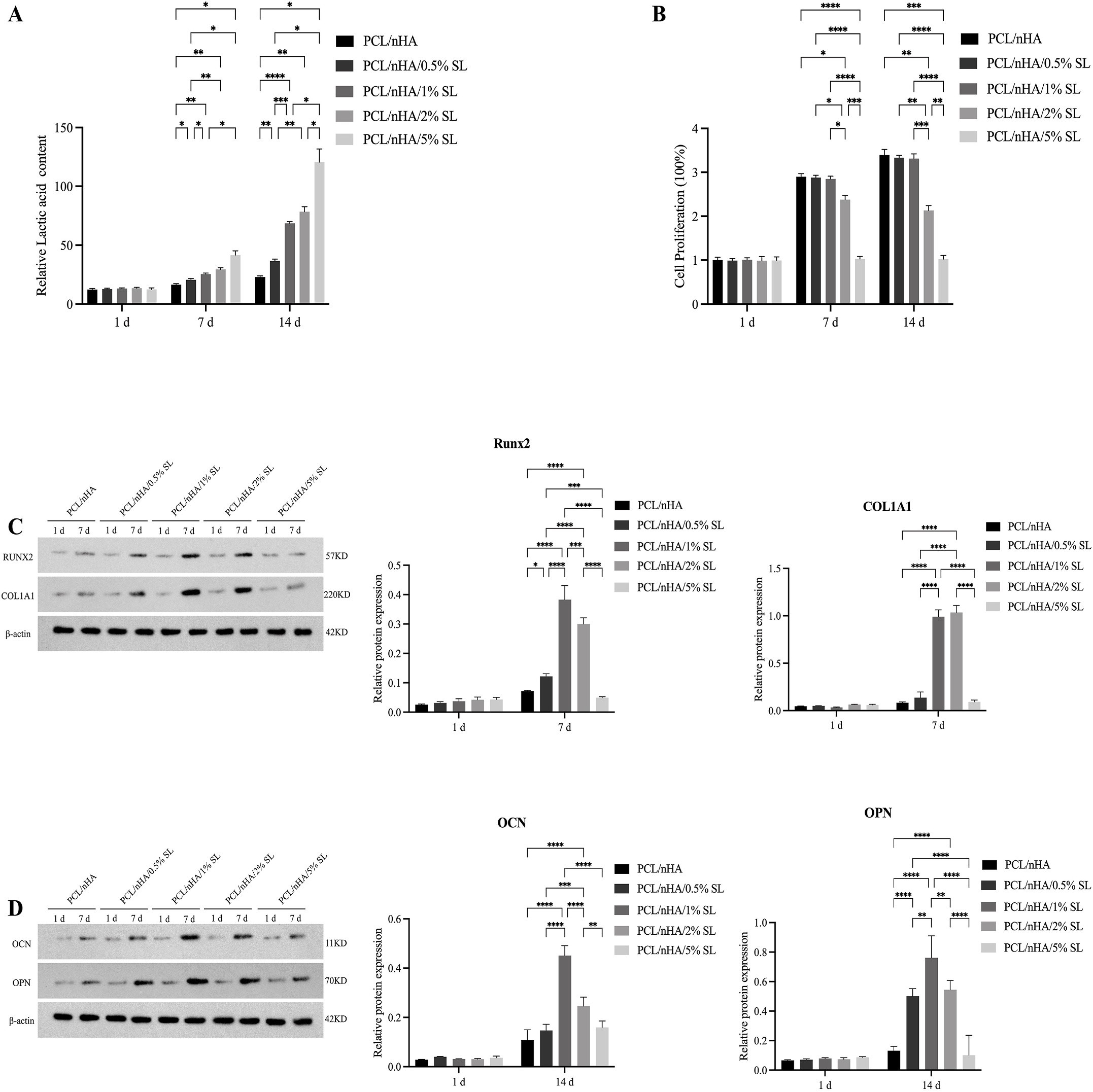 成骨誘導(dǎo)培養(yǎng)基培養(yǎng)14天后,檢測ALP活性、ARS礦化及Western blot(Runx2、COL1A1、OCN、OPN),全程定量乳酸水平。