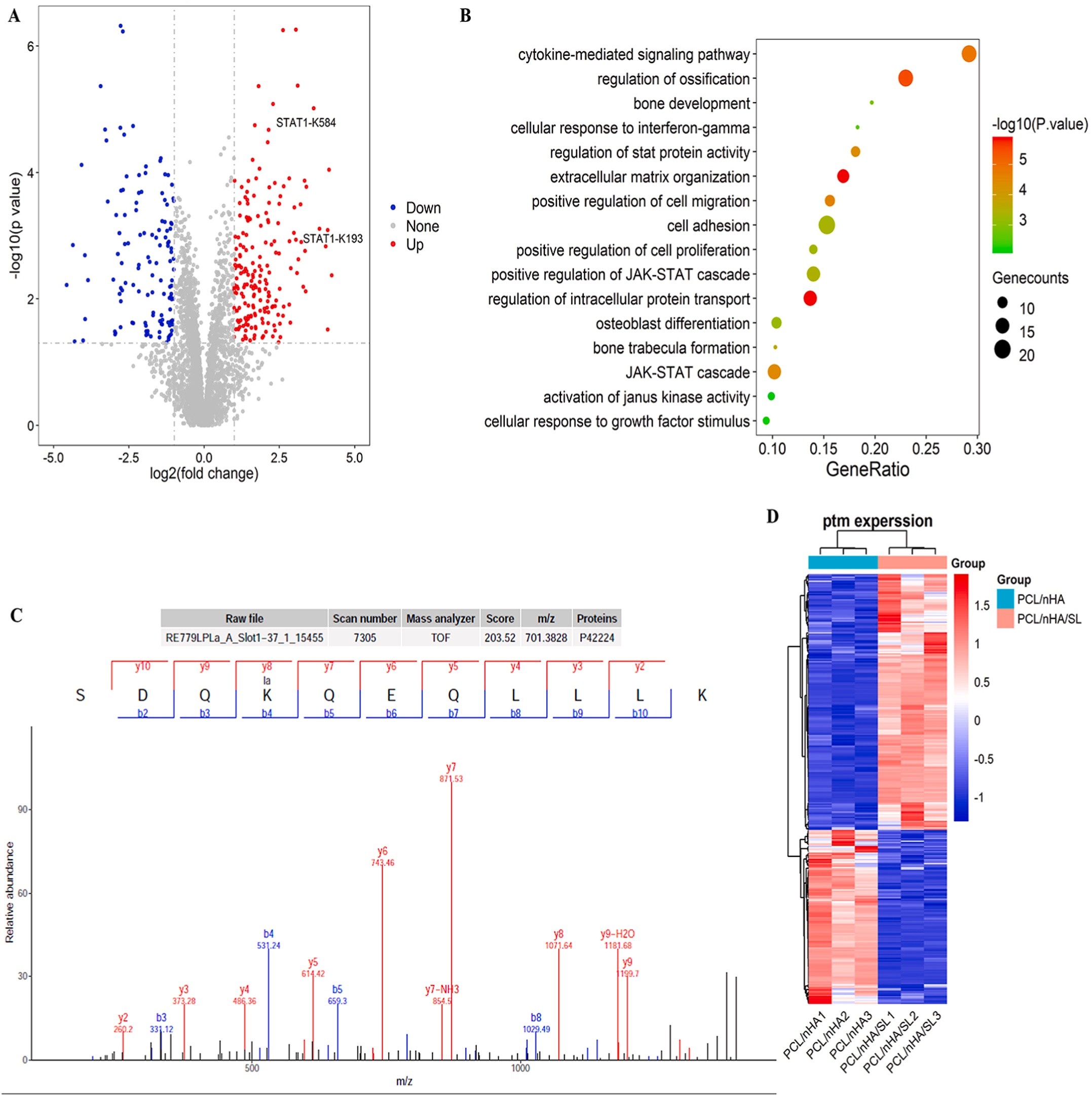 BMSCs在PCL/nHA/SL或PCL/nHA支架上培養(yǎng)14天后,提取蛋白并胰酶消化,采用抗K-Lac抗體偶聯(lián)磁珠富集乳酸化肽段,通過4D無標(biāo)記LC-MS/MS(timsTOF Pro質(zhì)譜儀,Bruker)分析;使用MaxQuant(v1.6.15.0)匹配UniProt人類數(shù)據(jù)庫(2022),篩選差異乳酸化位點(FC>1.5,P<0.05),并進行GO/KEGG富集分析(Fisher精確檢驗,P<0.05);手動驗證STAT1-K193乳酸化(Mascot評分>200,定位概率>99%)。