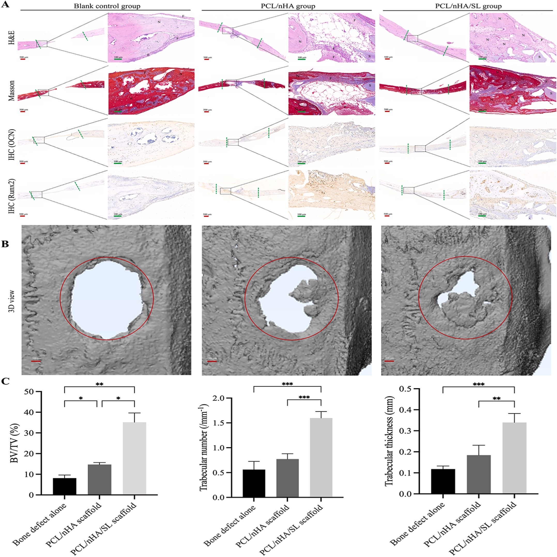 對SD大鼠(n=6/組)構(gòu)建5 mm直徑臨界尺寸顱骨缺損模型,實驗組植入支架,對照組不處理;12周后取材,4% PFA固定,采用:① 顯微CT(Skyscan 1176)掃描,CTAn軟件定量新骨形成(BV/TV、Tb.N、Tb.Th);② 組織學(xué)染色(HE、Masson三色染色);③ 免疫組化(OCN、RUNX2)。