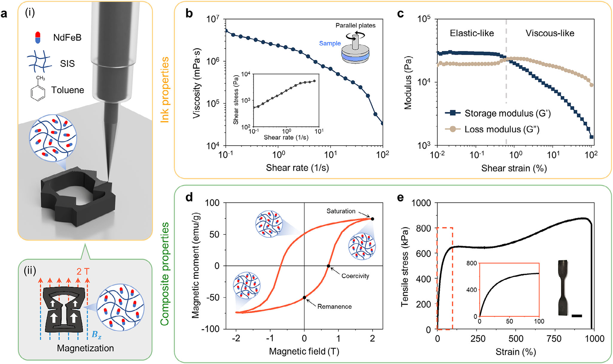 4D 打印磁活性材料。 a) 打印-充磁兩步工藝; b) 墨水剪切變??; c) 儲能與損耗模量; d) 剩磁 50 emu g?1、矯頑力 700 mT; e) 拉伸模量 ≈400 kPa,斷裂伸長>900 %。