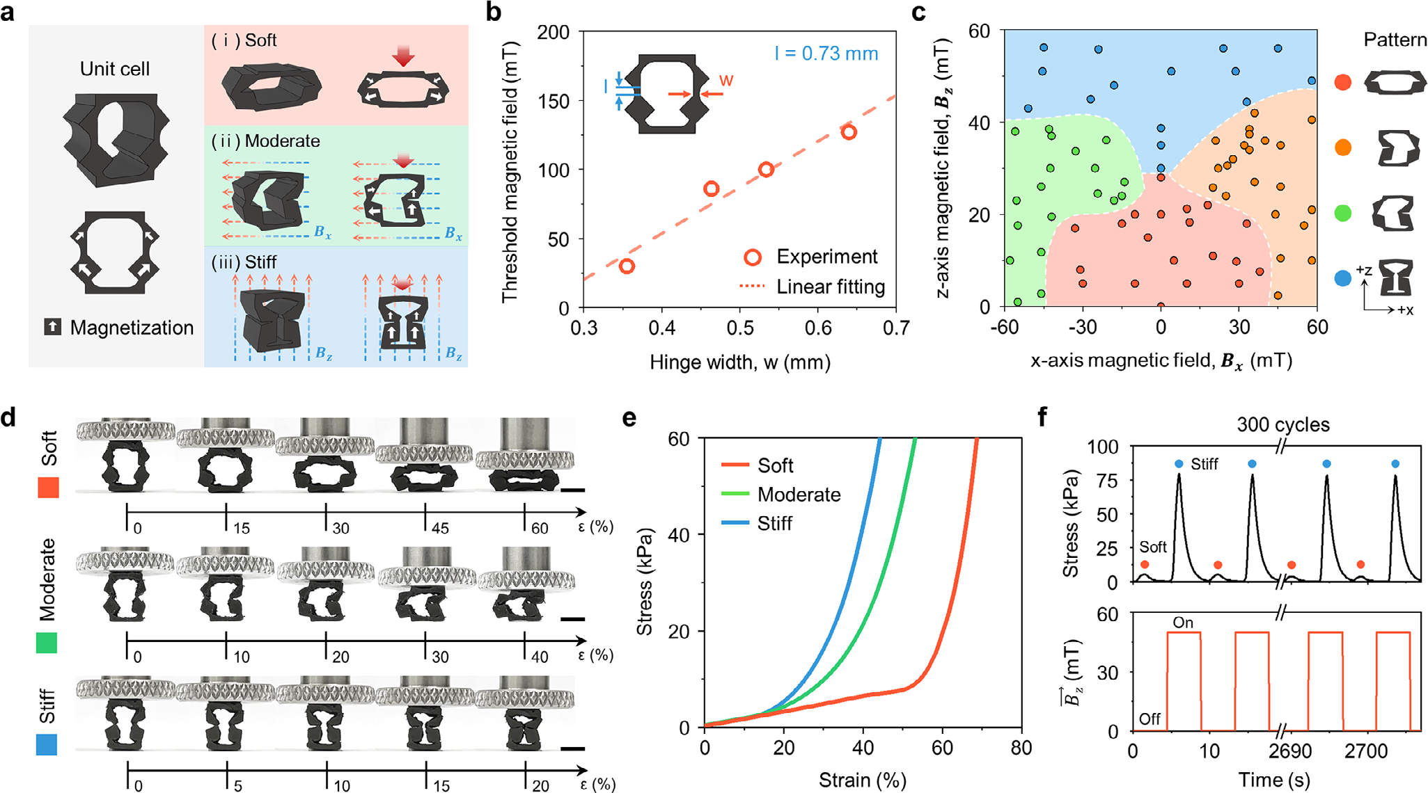單單元三態(tài)壓縮行為。 a) 三態(tài)示意; b) 鉸鏈厚度與臨界磁場關(guān)系; c) 磁場方向-狀態(tài)相圖; d) 實驗變形序列; e) 對應(yīng)應(yīng)力-應(yīng)變曲線; f) 300 周期循環(huán)穩(wěn)定性。