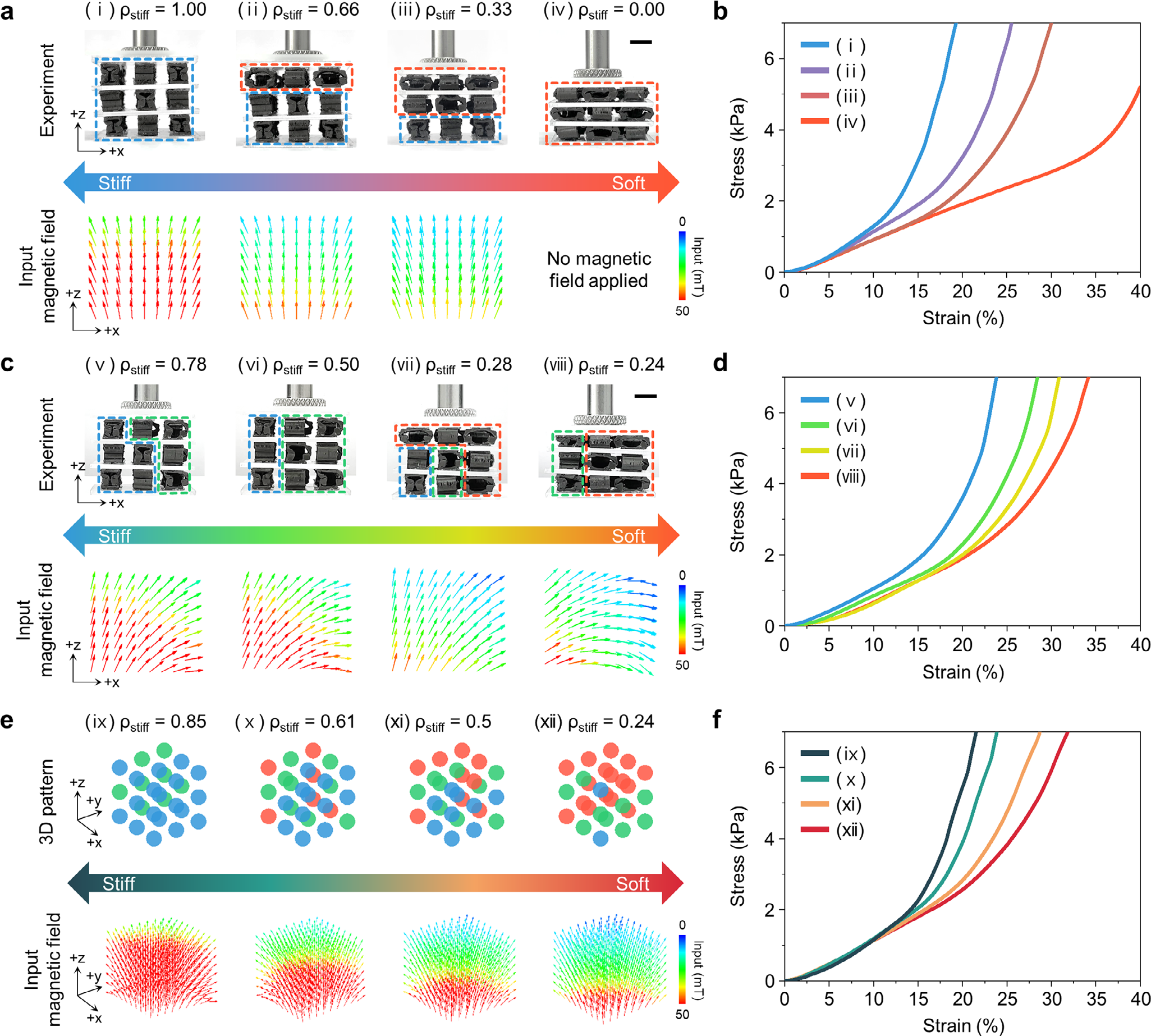 3×3×3 陣列。 a)-b) 沿 z 軸梯度場實現(xiàn)層狀剛度組合; c)-d) 沿 x 軸引入中態(tài); e)-f) 三軸磁場協(xié)同控制 27 單元任意剛度分布。
