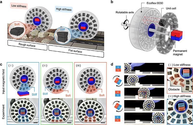 MTSM 剛度可調(diào)車輪。 a) 概念:軟態(tài)越障、硬態(tài)穩(wěn)行; b) 爆炸視圖; c) 三態(tài)變形對比(0.88 N 載荷); d) 連續(xù)越障實驗,N/S 極切換實現(xiàn)軟/硬實時轉(zhuǎn)換。