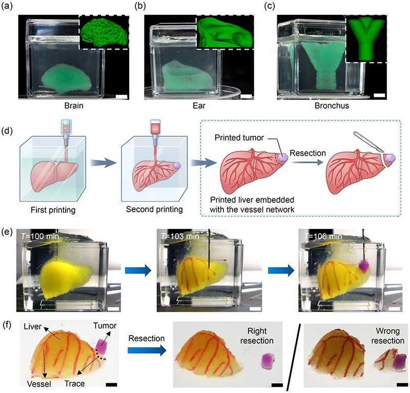 圖5:使用GC水凝膠打印的腦、耳、支氣管模型及用于術(shù)前規(guī)劃的肝臟模型(含血管網(wǎng)絡(luò)和腫瘤)