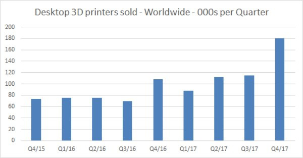 3D打印行業(yè)研究機構Context提供的季度數(shù)據(jù)顯示,桌面級3D打印機市場在2018年經歷了加速增長,銷量同比增長52%。2017年桌面級3D級打印機的銷量接近50萬臺。與2017年35%和2016年38%的數(shù)據(jù)相比,這是一個相當大的轉變。