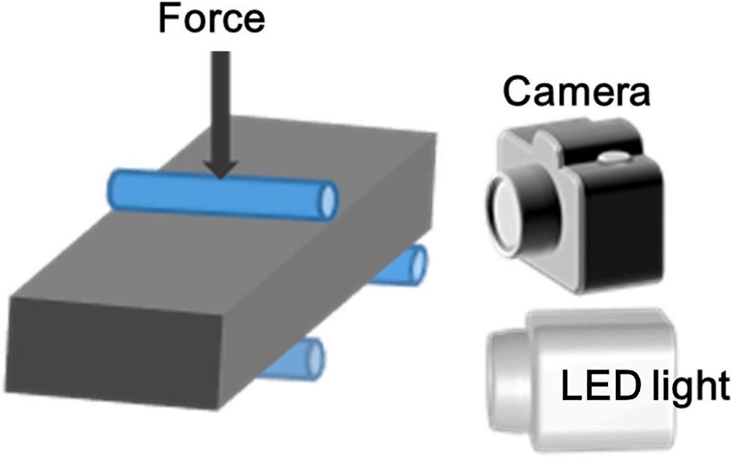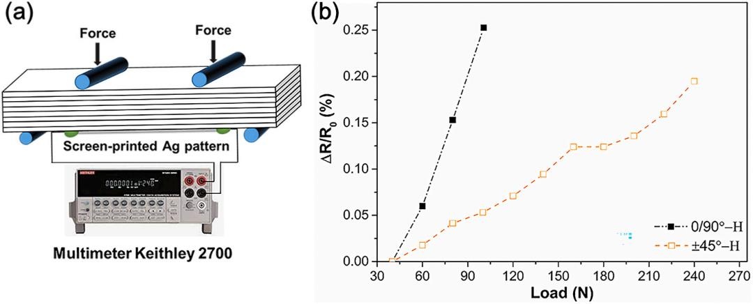 圖10:(a)四點彎曲試驗示意圖,(b)相對電阻變化率作為負載的函數(shù)。