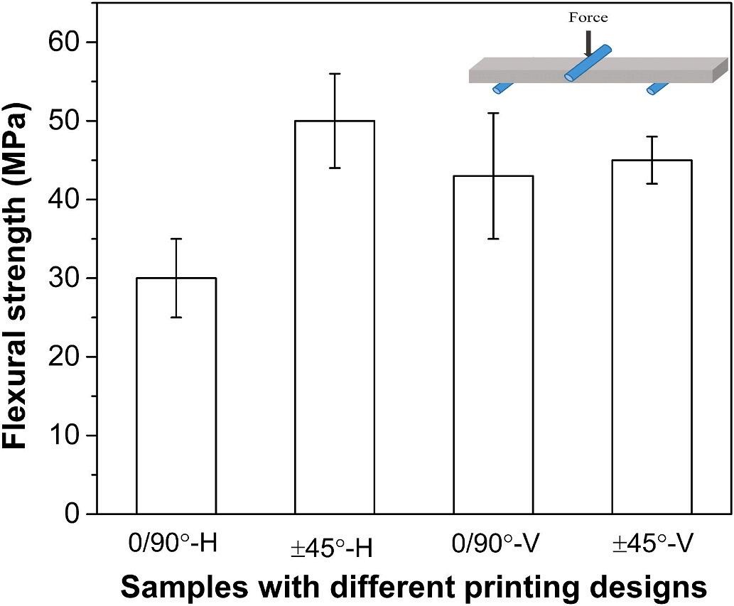 打印方向(水平或垂直)和細絲方向(0/90°和±45°)顯著影響抗彎強度,其中水平打印方向和±45°細絲方向的樣品抗彎強度最高(50 MPa)。