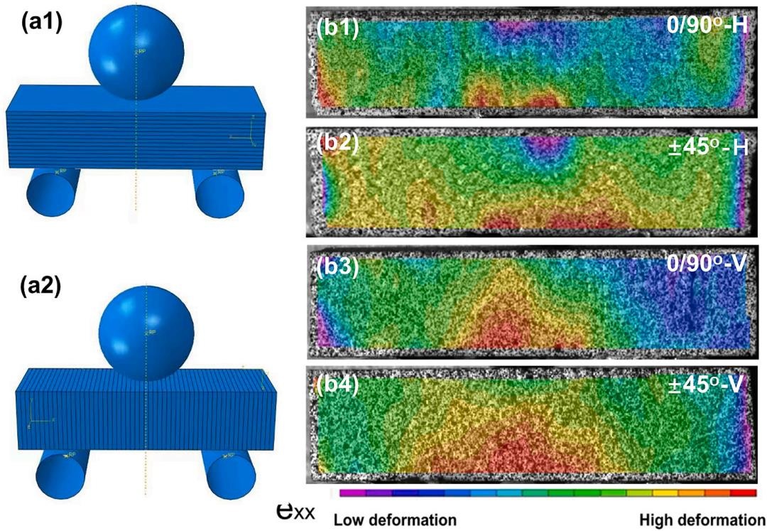 結合DIC技術分析了不同打印設計在受力下的應變分布情況。結果顯示,±45°取向的樣品在受力時應變分布更為均勻,而0/90°取向的樣品則表現(xiàn)出更集中的應變區(qū)域,這可能與裂紋的起始和擴展路徑有關。