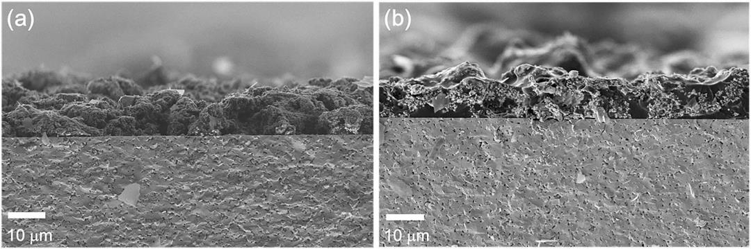 圖11:附有銀涂層的斷裂氧化鋯樣品的橫截面FESEM圖像:(a)0/90°細絲取向,(b)±45°細絲取向。