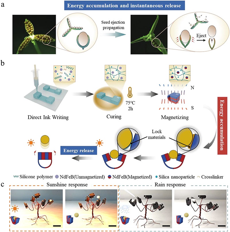 本研究選擇模仿紫花地丁軟驅(qū)動器作為典型案例。紫花地丁種子莢具有獨(dú)特的彈射機(jī)制,依靠濕度敏感的纖維結(jié)構(gòu)進(jìn)行能量儲存和快速釋放。受其啟發(fā),本研究使用直接墨水書寫(DIW)技術(shù)制備了儲存磁能驅(qū)動器,以聚二甲基硅氧烷(PDMS)為柔性基體。