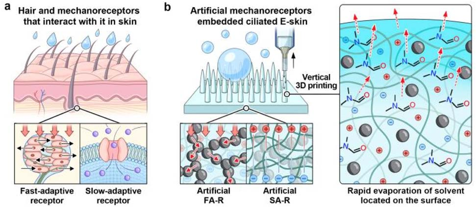 全球 80% 以上的跨境貿(mào)易依賴海運(yùn),船員長(zhǎng)期處于密閉、高濕的船舶環(huán)境中,易出現(xiàn)血壓異常、循環(huán)障礙、自主神經(jīng)系統(tǒng)功能紊亂等健康問題。然而,傳統(tǒng)可穿戴傳感器在高濕環(huán)境下常因濕氣會(huì)引起信號(hào)不穩(wěn)定,難以實(shí)現(xiàn)持續(xù)生理監(jiān)測(cè);現(xiàn)有防水型電子皮膚(E-skin)又多存在靈敏度低、制備復(fù)雜等瓶頸,無法滿足海事場(chǎng)景的實(shí)用需求。為解決這一痛點(diǎn),華師大&韓國KAIST團(tuán)隊(duì)創(chuàng)新性地從人體皮膚表皮毛發(fā)與機(jī)械感受器的結(jié)構(gòu)功能中汲取靈感,提出 “垂直 3D 打印微纖毛 + 嵌入式人工機(jī)械感受器” 的協(xié)同設(shè)計(jì)方案,而森工 AutoBio1000 3D打印機(jī)憑借精準(zhǔn)的擠出控制與工藝兼容性,成為實(shí)現(xiàn)這一設(shè)計(jì)的關(guān)鍵設(shè)備支撐。