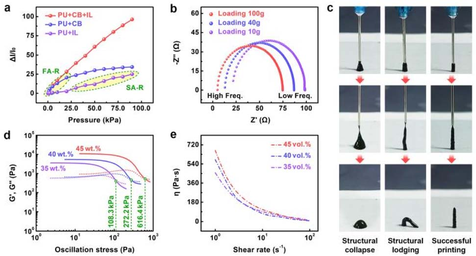 圖1:不同材料制成的薄膜的特性以及微纖毛的打印工藝。(a) 不同材料制成的薄膜在壓力下的電響應(yīng)。(b) 由PU、CB和IL制成的薄膜在不同加載條件下的阻抗奈奎斯特圖。(c) 不同油墨垂直3D打印微纖毛過程中關(guān)鍵時(shí)刻的照片。從左到右,油墨的CB含量分別為35 wt%、40 wt%和45 wt%。(d) 三種油墨樣品的流變特性。實(shí)線和虛線分別代表儲(chǔ)能模量(G')和損耗模量(G'')。(e) 油墨樣品的表觀粘度(h)與剪切速率的函數(shù)關(guān)系.