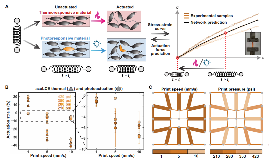 選擇液晶彈性體(LCE)作為研究對象,開發(fā)了兩種LCE配方:偶氮苯功能化LCE(azoLCE,響應熱和紫外光)和純LCE(neatLCE,僅響應熱)。采用多材料高溫直接墨水書寫(HOT-DIW)3D打印技術(shù),確定打印速度、壓力和路徑數(shù)為關(guān)鍵制造參數(shù),通過實驗表征這些參數(shù)對材料剛度和變形性能的影響,并將實驗數(shù)據(jù)用于訓練神經(jīng)網(wǎng)絡(luò)模型。