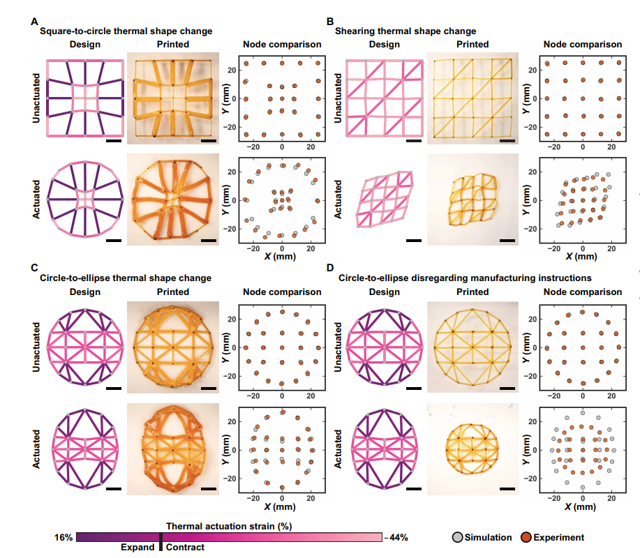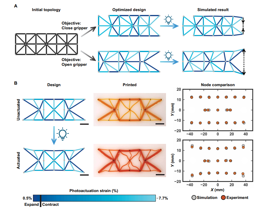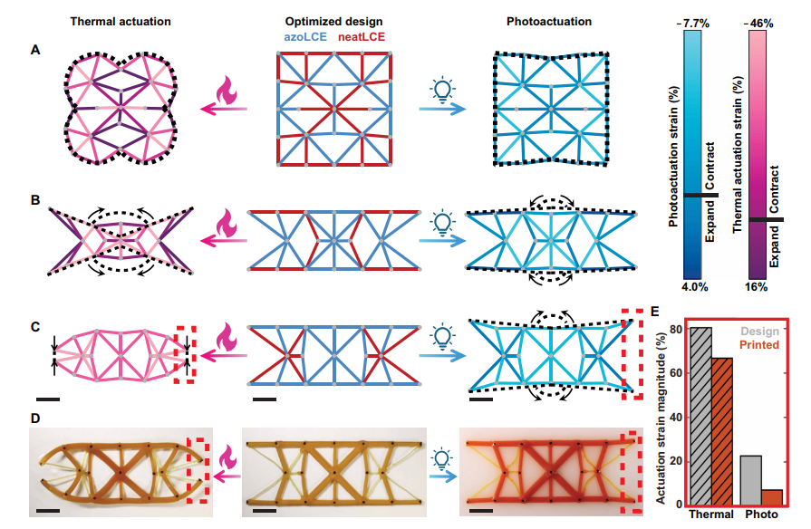 目前,相關(guān)研究在響應材料、制造能力和仿真模型方面取得了一定進展,已開發(fā)出能對熱、光、濕度等多種刺激做出反應的材料系統(tǒng),并應用于微創(chuàng)手術(shù)、藥物遞送等多個領(lǐng)域。但現(xiàn)有研究多側(cè)重于制造創(chuàng)新,缺乏有效的逆向設(shè)計方法,大多依賴人類經(jīng)驗或啟發(fā)式方法設(shè)計,難以實現(xiàn)復雜的形狀變形行為。同時,現(xiàn)有逆向設(shè)計方法多針對單一刺激(尤其是熱刺激),且未充分考慮制造過程的優(yōu)化,無法滿足多刺激響應材料系統(tǒng)的設(shè)計需求。