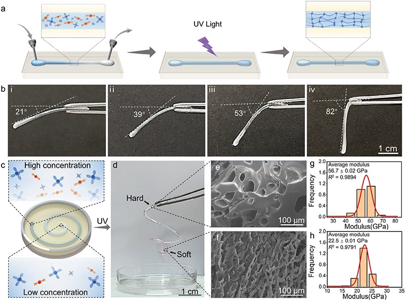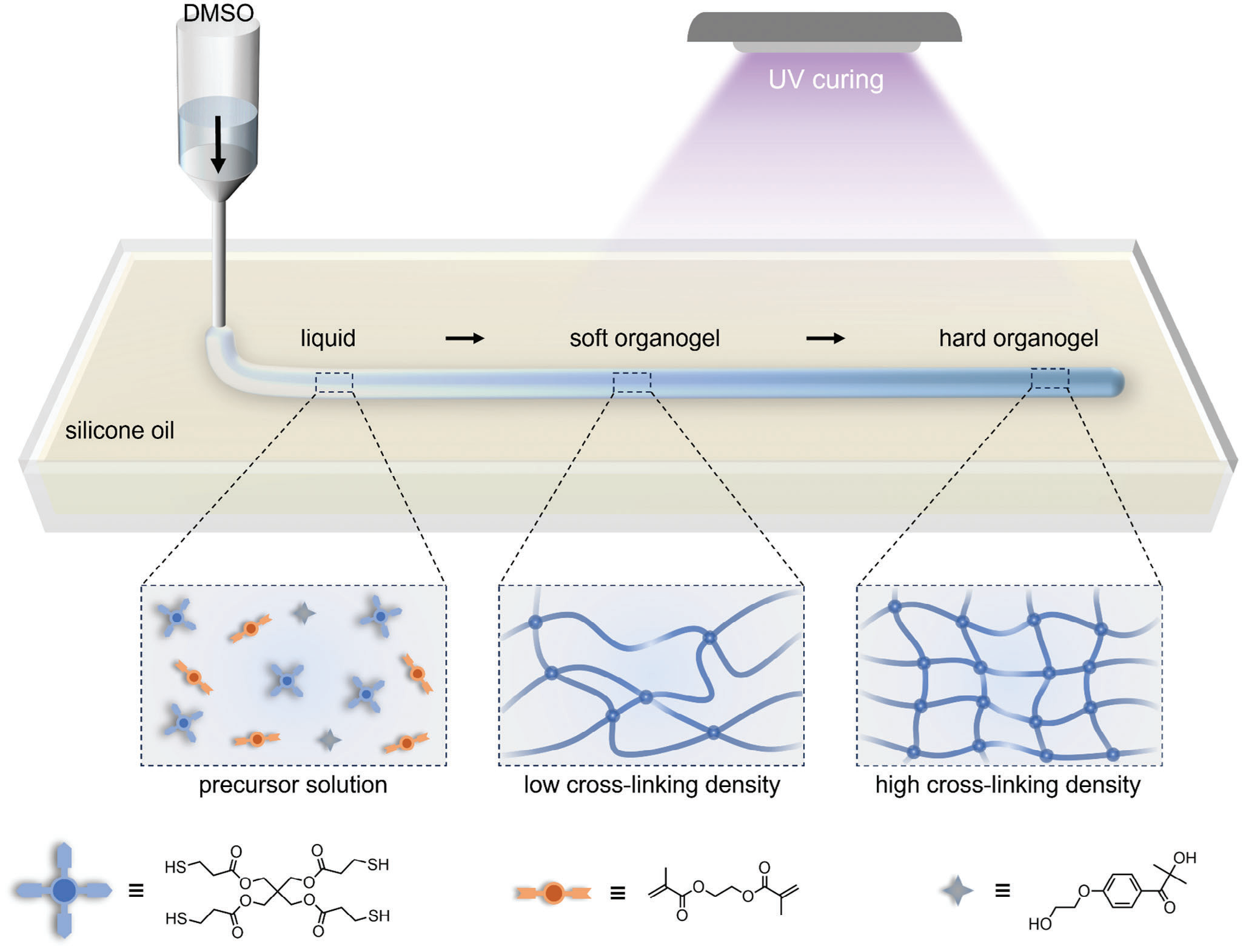 以3D打印的液體通道為模板,通過在DMSO相中引入前驅(qū)體并進行聚合反應,制備纖維狀有機凝膠。采用光誘導自由基介導的硫醇-烯點擊反應,將含四官能硫醇交聯(lián)劑(PTMP)、雙官能烯烴單體(EDA)和UV光引發(fā)劑(HEMP)的混合溶液注入通道,經(jīng)UV固化30分鐘后獲得透明線性有機凝膠。