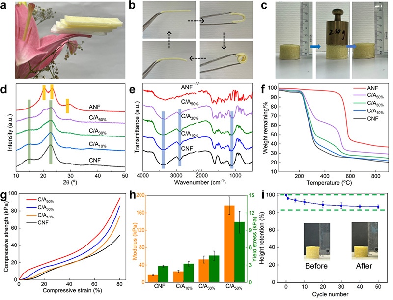 圖1. (a) CNF、C/A10%、C/A30%和C/A50%氣凝膠置于花瓣上的照片;(b) C/A50%氣凝膠彎曲和卷曲的照片;(c) C/A50%氣凝膠加載200g重物前后的照片;(d) 不同氣凝膠的XRD圖譜;(e) 不同氣凝膠的FT-IR光譜;(f) 不同氣凝膠的TG曲線;(g) 不同氣凝膠的壓縮應(yīng)力-應(yīng)變曲線;(h) 對應(yīng)楊氏模量和屈服應(yīng)力值;(i) C/A50%氣凝膠在50次疲勞測試中的高度保持率