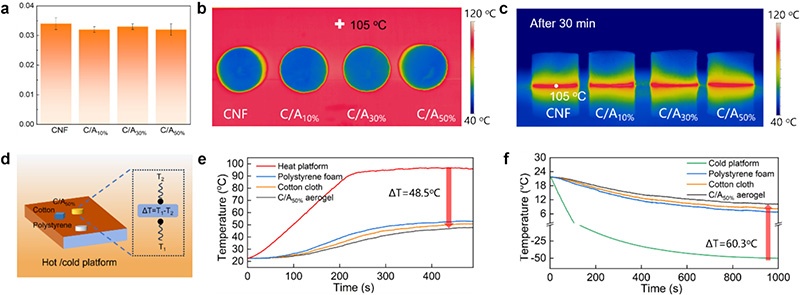 圖2. (a) 不同氣凝膠的熱導(dǎo)率;(b) 105℃加熱下氣凝膠的紅外熱成像俯視圖;(c) 加熱30分鐘后氣凝膠的紅外熱成像側(cè)視圖;(d) 冷熱環(huán)境測試裝置示意圖;(e) C/A50%氣凝膠、棉織物和聚苯乙烯泡沫在96℃高溫下的溫度-時間曲線;(f) C/A50%氣凝膠、棉織物和聚苯乙烯泡沫在-50℃低溫下的溫度-時間曲線