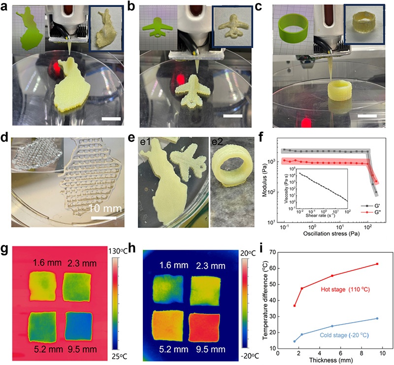 圖3. (a-c) C/A50%氣凝膠3D打印成芬蘭地圖、飛機和環(huán)形結(jié)構(gòu)(左圖為設(shè)計模型,右圖為干燥后氣凝膠,比例尺2cm);(d) 3D打印纖維素水凝膠網(wǎng)格的光學(xué)照片(比例尺10mm);(e) 打印樣品漂浮在水上(e1)和自支撐環(huán)形結(jié)構(gòu)(e2);(f) C/A50%墨水在1Hz恒定頻率下動態(tài)應(yīng)力掃描的對數(shù)-對數(shù)圖(插圖為穩(wěn)態(tài)粘度隨剪切速率變化的對數(shù)-對數(shù)圖);(g) 不同厚度3D打印C/A50%氣凝膠在熱板上的紅外圖像;(h) 不同厚度3D打印C/A50%氣凝膠在干冰冷板上的紅外圖像;(i) 不同厚度氣凝膠與冷熱板的溫差