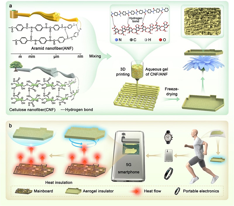Scheme 1. (a) 3D打印制備CNF/ANF氣凝膠的流程示意圖;(b) 氣凝膠用于便攜式電子設(shè)備隔熱的示意圖