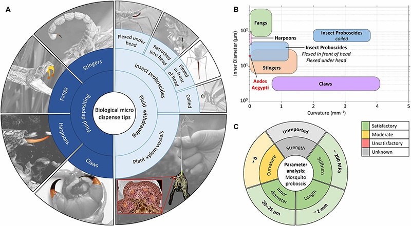 自然界中存在多種具有復雜結(jié)構(gòu)和優(yōu)異性能的微型分配尖端,如昆蟲口器和植物木質(zhì)部導管。雌性蚊子口器具有堅硬、近乎筆直的結(jié)構(gòu),配備振動輔助機制,能夠以最小的力刺穿表面并精確進入血管,其獨特的機械、幾何和結(jié)構(gòu)特性使其成為分配應用的理想候選材料。